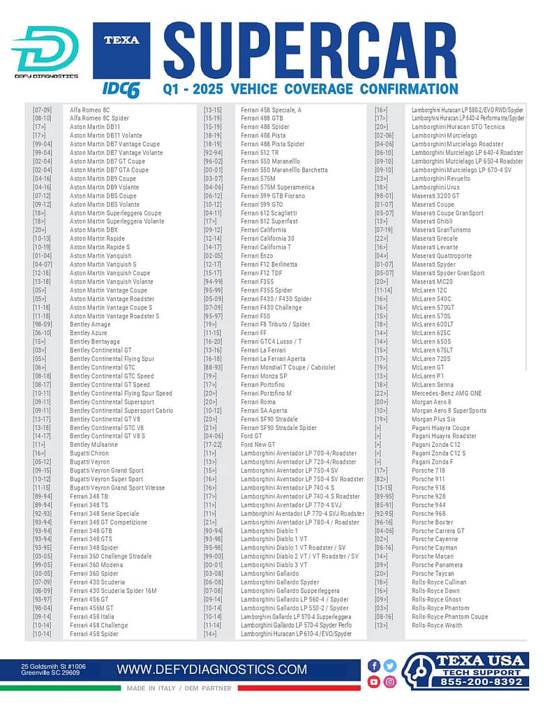 - Full OEM‑level diagnostics: Ferrari, Lamborghini, Porsche, Maserati, McLaren, Aston Martin, Pagani.